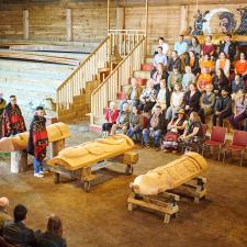 Chris Silver, Councillor from Semá:th First Nation and a grade 11 student from Yale Secondary, Fraser Smith, opened the honouring with a welcome song. The speaker of the ceremony, Perry Smith, who currently serves as the Director of Curriculum for the Abbotsford School District, shared with the audience that he and the artists would be blanketed and have their heads wrapped with a headband to symbolize having a good heart and good thoughts during the event. Witnesses were then called to remember the event, and some were called to speak about the work taking place. Artists were then walked around the longhouse and directed to stand on cedar bows placed upon the ground to represent a place "where no one had stood before them".