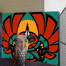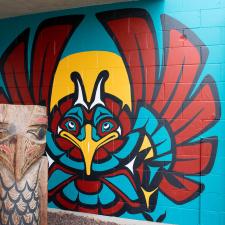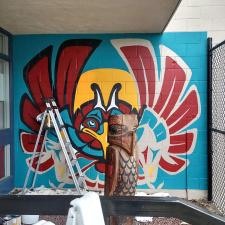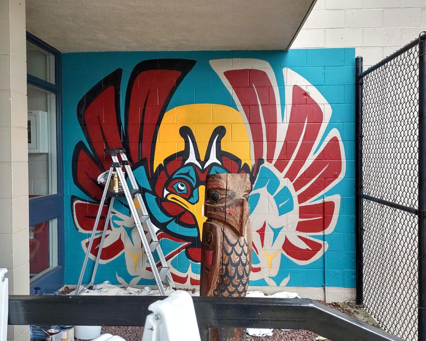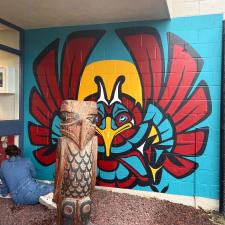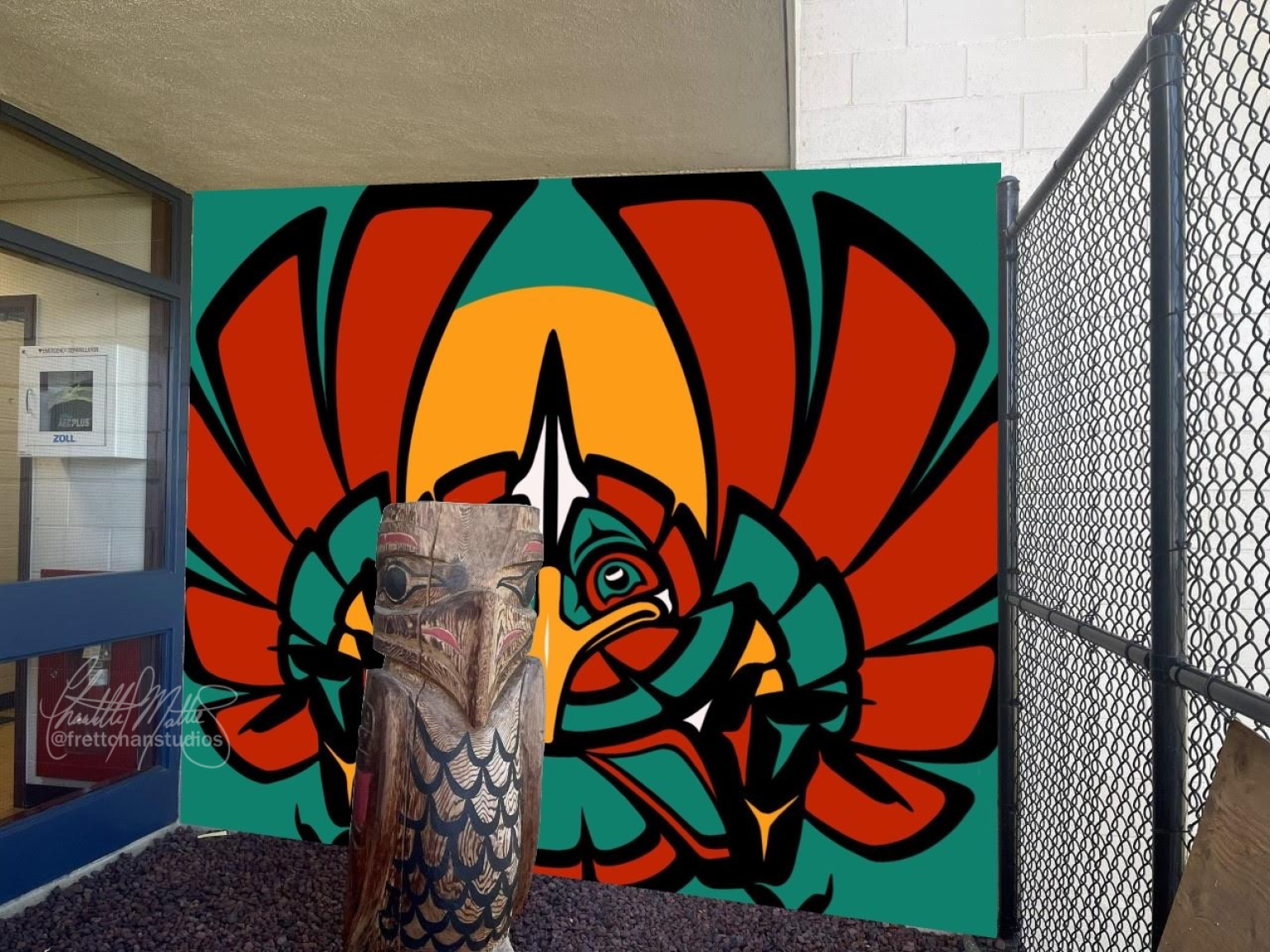 In the fall of 2021, Carlos Julian, an Indigenous Support Worker at John Maclure Community School, emailed a local Indigenous artist in hopes that they would be able to paint a mural at the school in honour of their mascot, a Thunderbird. The artist's work captured Carlos' interest online for her colourful, bold and beautiful First Nations-style art.