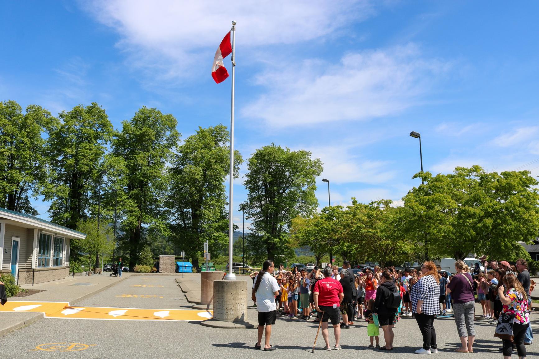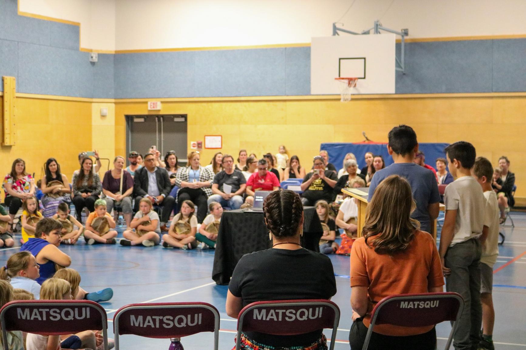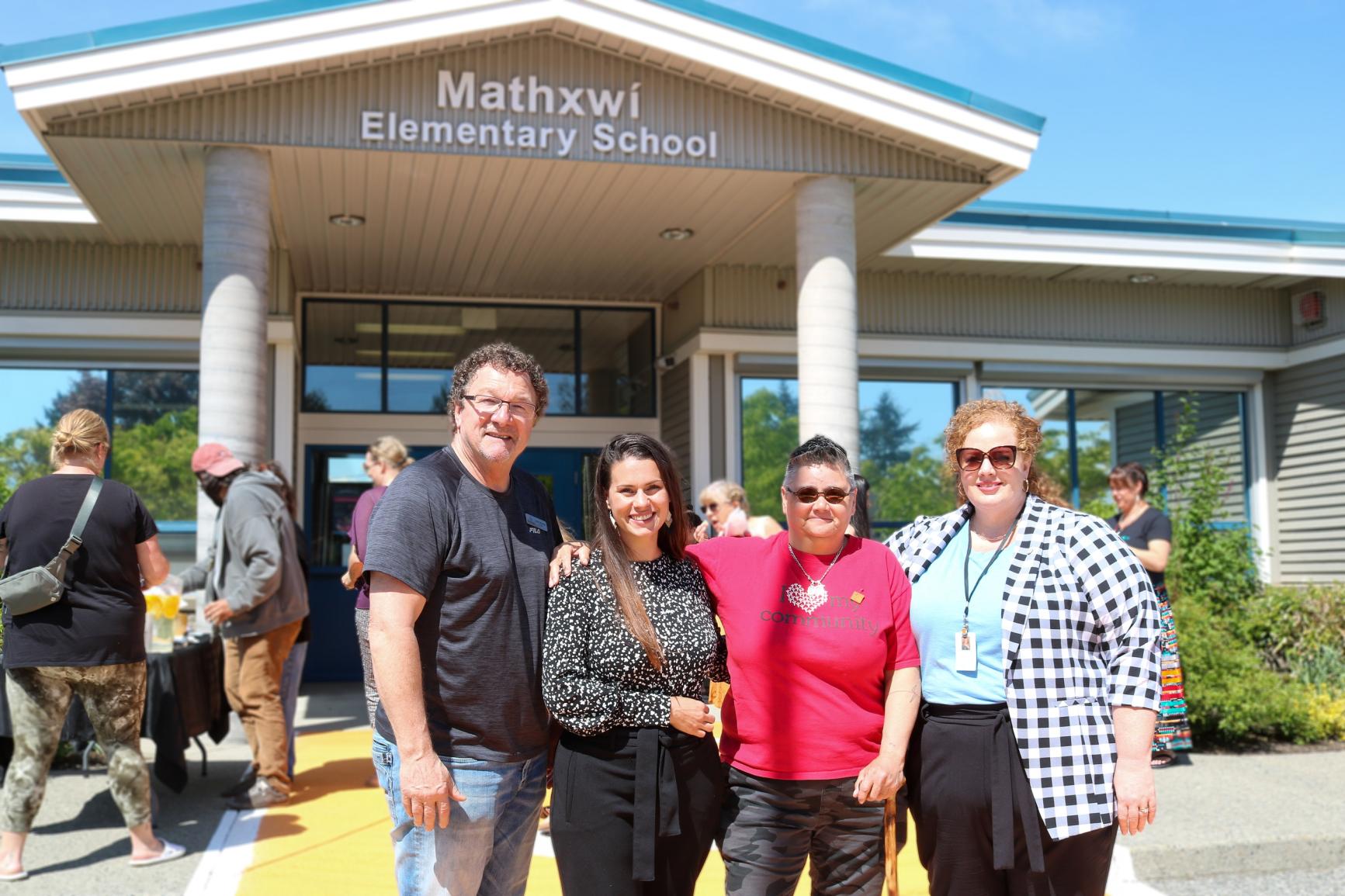 The celebratory atmosphere was set by a class at Mathxwí Elementary, who performed the Temxaxa sth'oqwi, the sacred salmon time song, under the guidance of Ms. Carlin Swift. The event continued with a crosswalk procession led by Tyrone Thomas and Ronald Francis-Modeste, guiding the guests and students outside for the official ribbon-cutting ceremony. Chief Alice McKay, Haley Cole, Assistant Superintendent Perry Smith, and a student from Mathxwí First Nation had the honour of cutting the ribbon, officially inaugurating the crosswalk for students and families of the school community and concluding the ceremony.