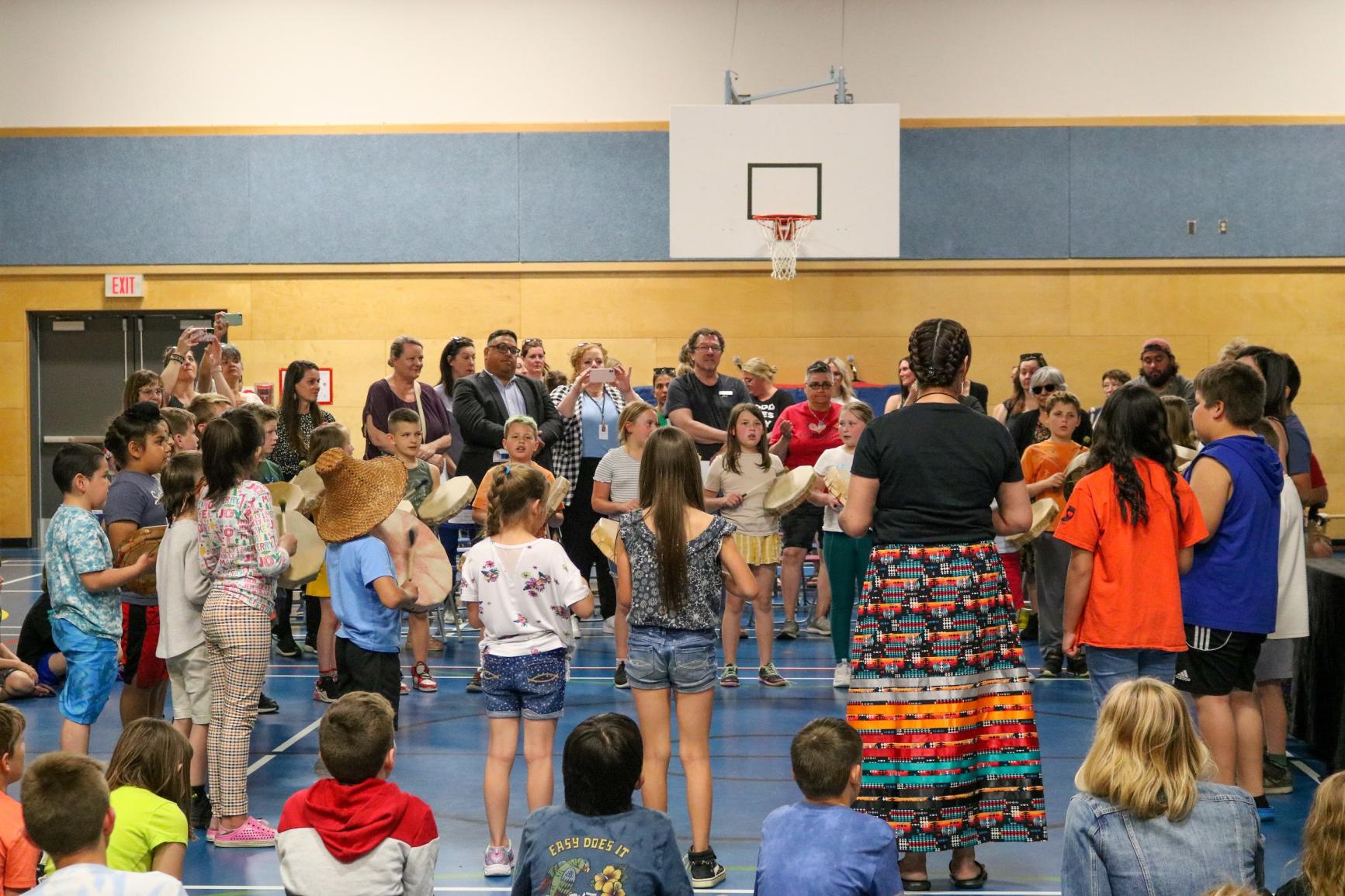 The flagship crosswalk that leads directly to the school’s front door features seven white eagle feathers painted on an orange background. Each feather represents a sacred teaching recognized by many Indigenous communities across Canada - truth, honesty, love, humility, respect, courage, and wisdom. The celebration commenced with three students, who had received teachings from Indigenous Knowledge Keeper, Darren Charlie, sharing these historical and cultural significances with the audience.