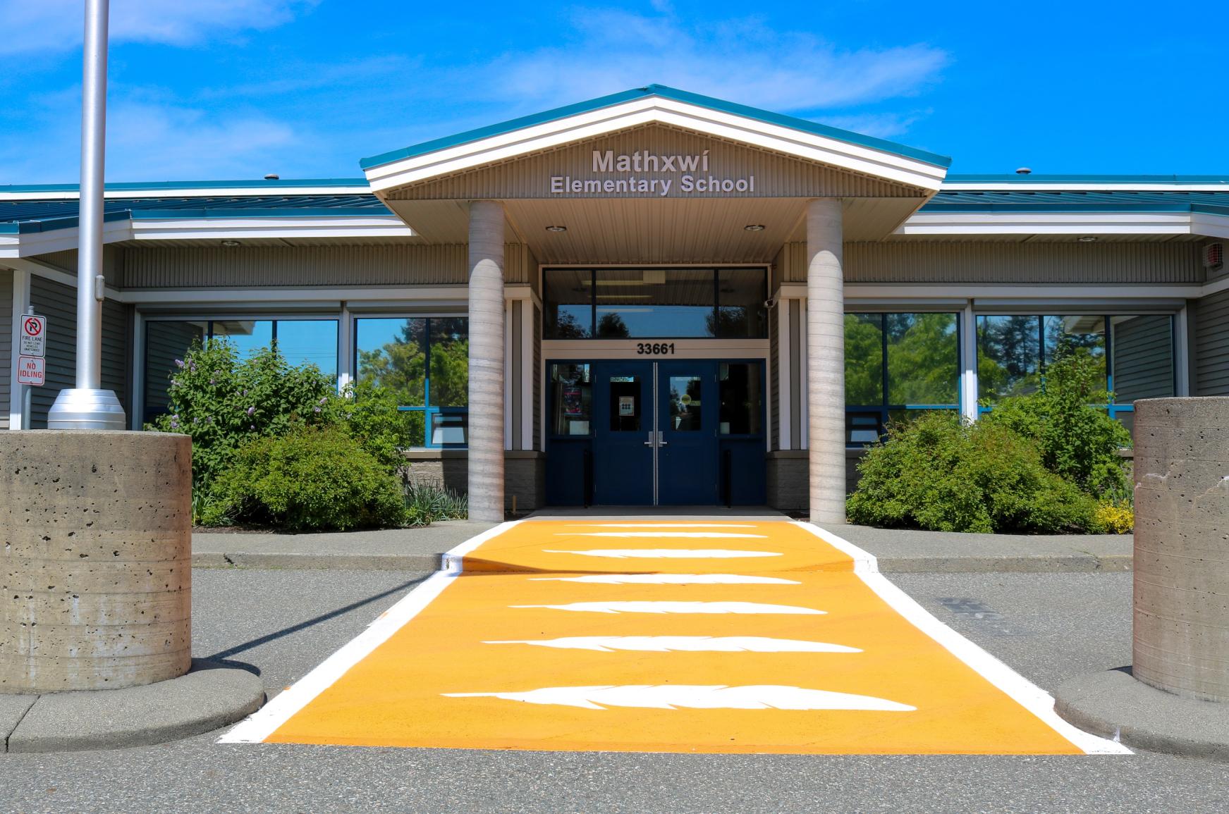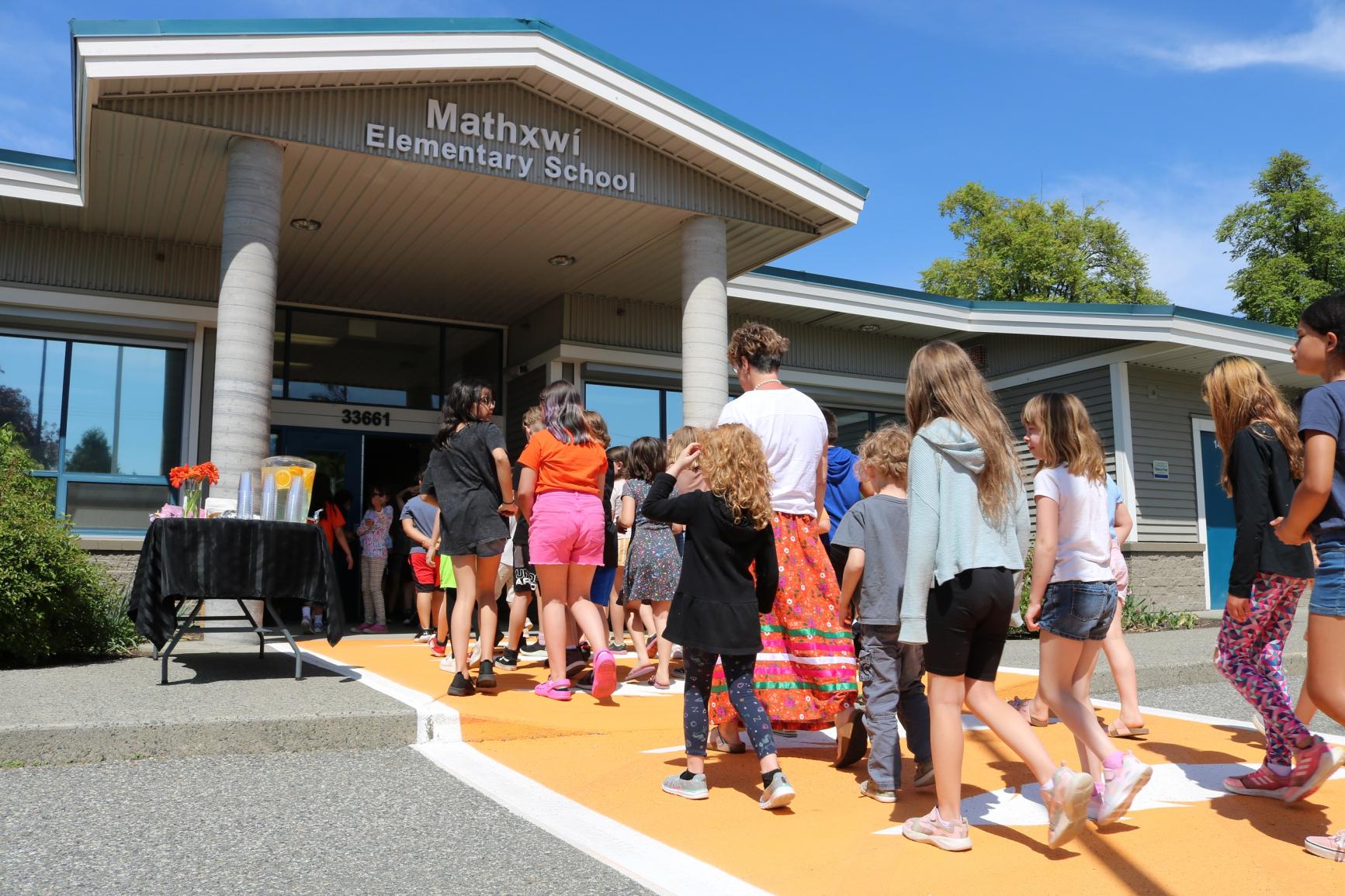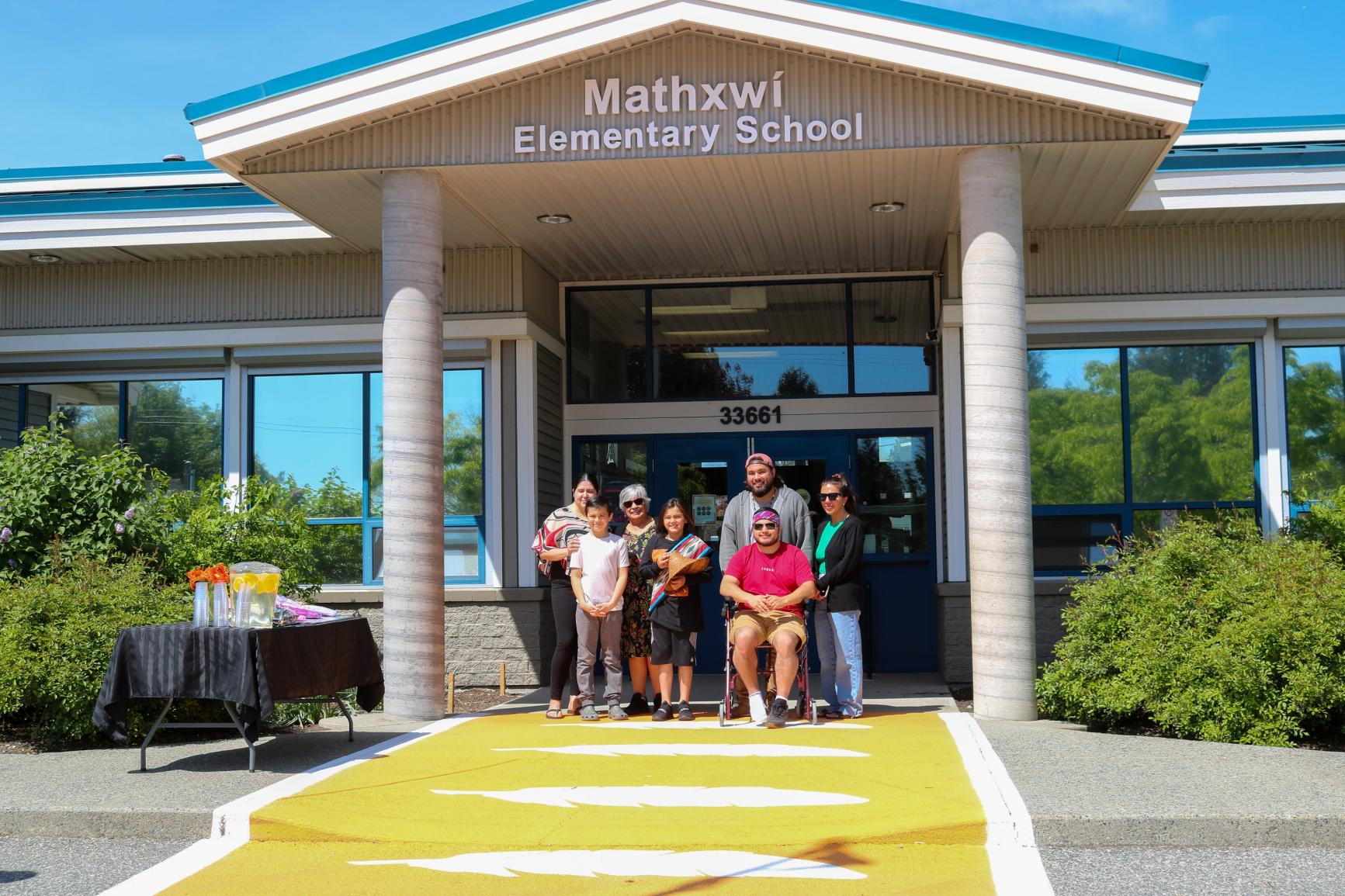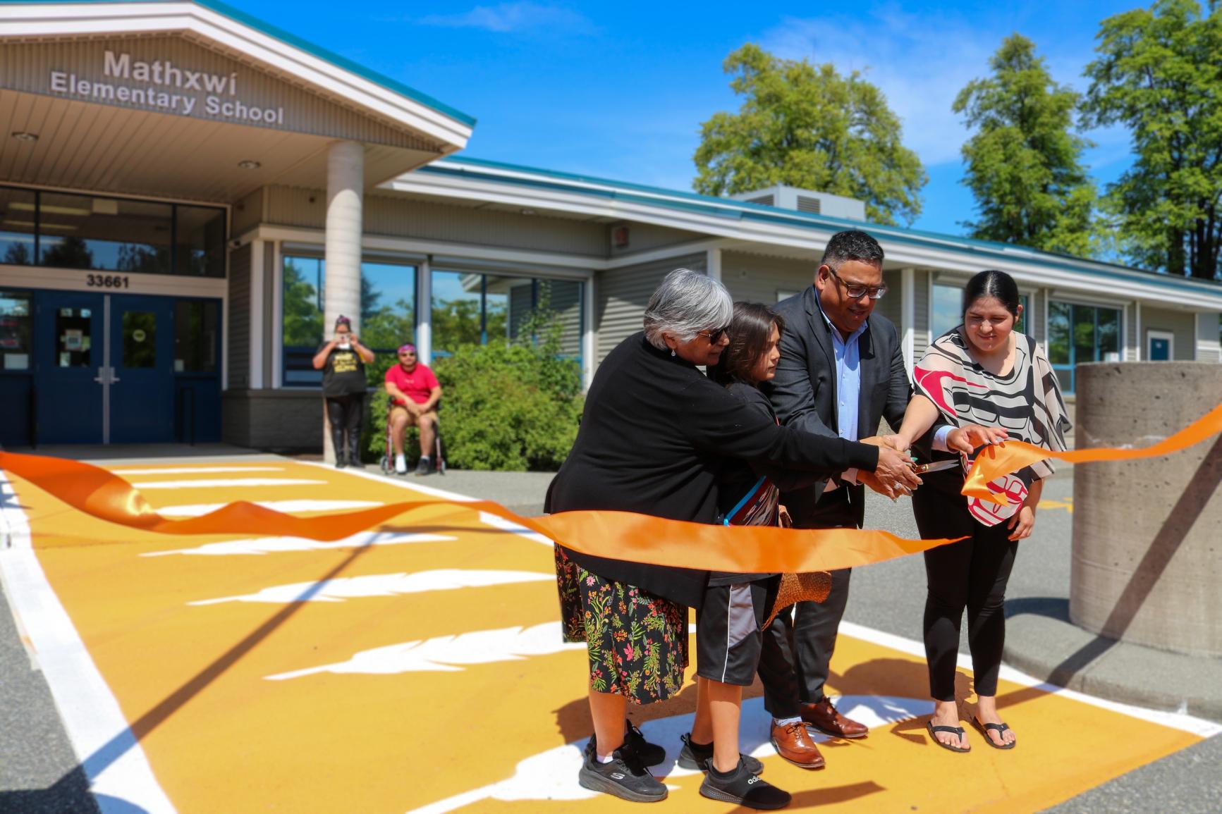 Mathxwí Elementary marked a significant milestone this month as they officially opened their new orange and eagle feathered crosswalk, the first in the Abbotsford School District. The event was attended by members from the school community, Mathxwí First Nation, the president of the Fraser Valley Métis Association, the Abbotsford Board of Education, and school district staff.