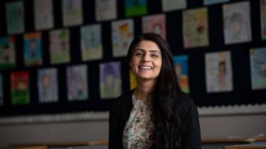 A room in a school is set up exactly like a polling station, with students volunteering as the election officers.